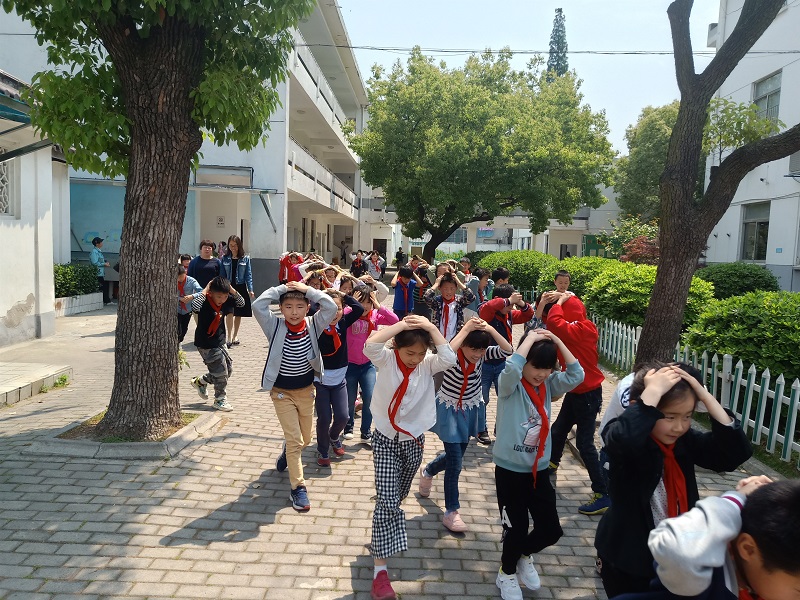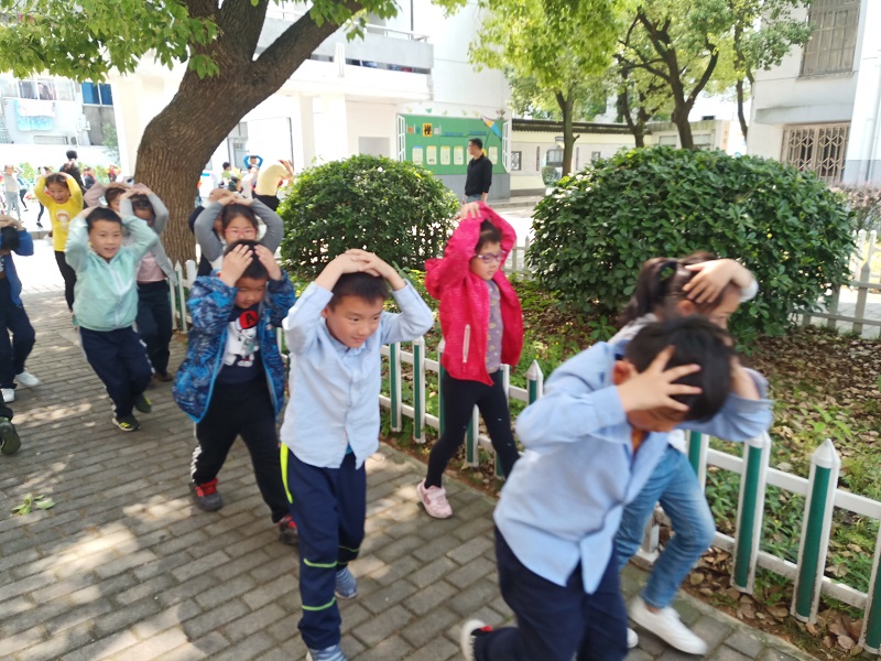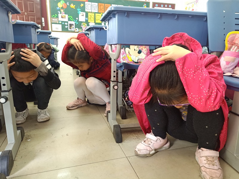 警报信号响起,各班同学在老师的指挥下抱头躲避在课桌下进行自我保护。随后,在警报声中师生全部按照预定的疏散路线,紧急而有序地从教室撤离到操场中间空旷地带,没有发生任何互相推挤或踩踏事故,整个演练过程井然有序。