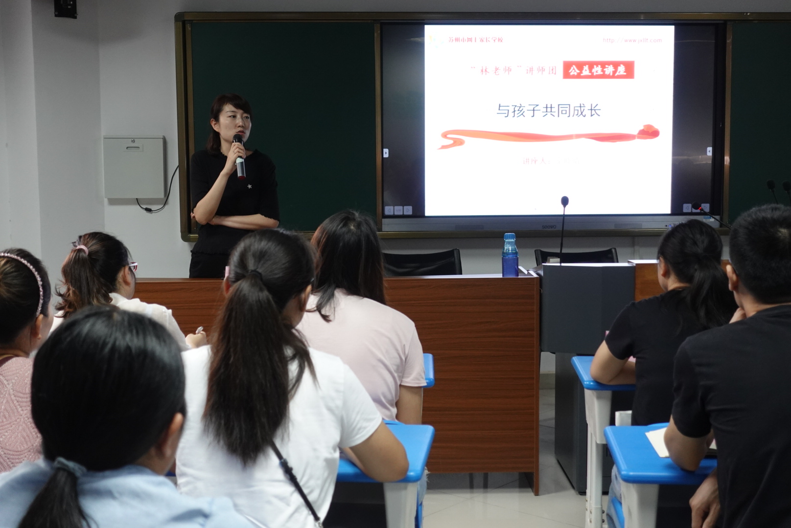 在本次家校活动中,学校一年级家长学校还邀请了苏州市林老师讲师团、资深心理指导专家金晓婧老师为家长们开设了主题为《与孩子共同成长》的专题讲座,这也是学校“金拇指陪伴项目”的主题活动之一。金老师从家庭教育和儿童心理的角度,与家长们探讨学生的入学适应、家长的教育陪伴等问题。生动的事例,专业的理论,金老师的娓娓道来,家长们认真聆听记录。讲座中,金老师与家长们亲切互动,解疑答惑,帮助家长更加了解自己的孩子,学习更加专业的家庭教育方法。